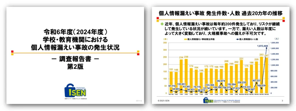株式会社JMCが運営事務局を務める教育ネットワーク情報セキュリティ推進委員会(ISEN)は、2025年11月13日に「令和6年度 学校・教育機関における個人情報漏えい事故の発生状況」調査報告書(第2版)を公表しました。