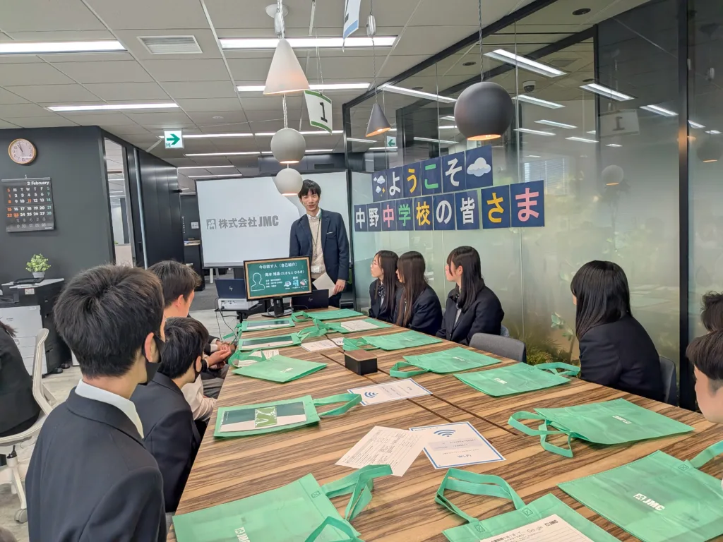 株式会社JMC(本社:東京都港区、代表取締役社長:松田憲明、以下JMC)は、2026年2月6日、相模原市立中野中学校の2年生を本社に招き、キャリア教育の一環として企業説明を実施しました。 本プログラムは、生徒たちが実際のオフィス環境に身を置き、社員の生の声に触れることにより「働くことの意義」を考え、自身の将来やキャリア形成について具体的なイメージを持つきっかけとなることを目的としています。